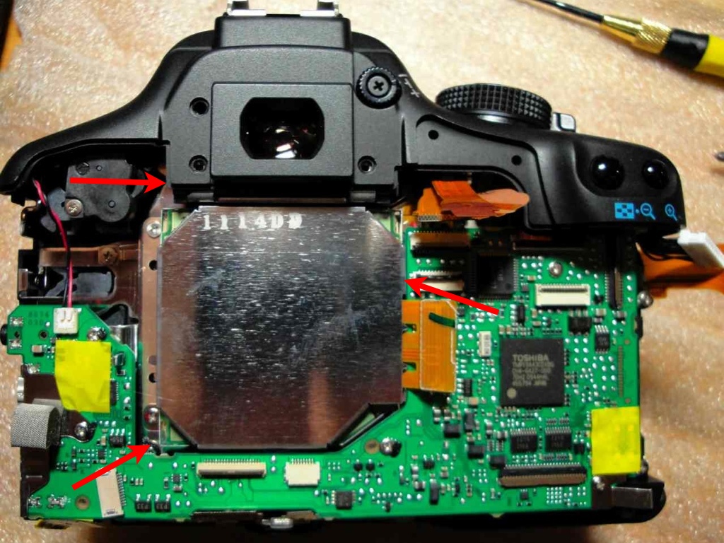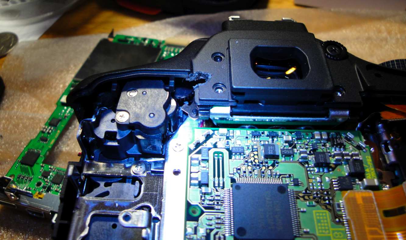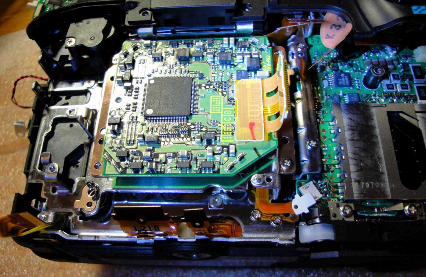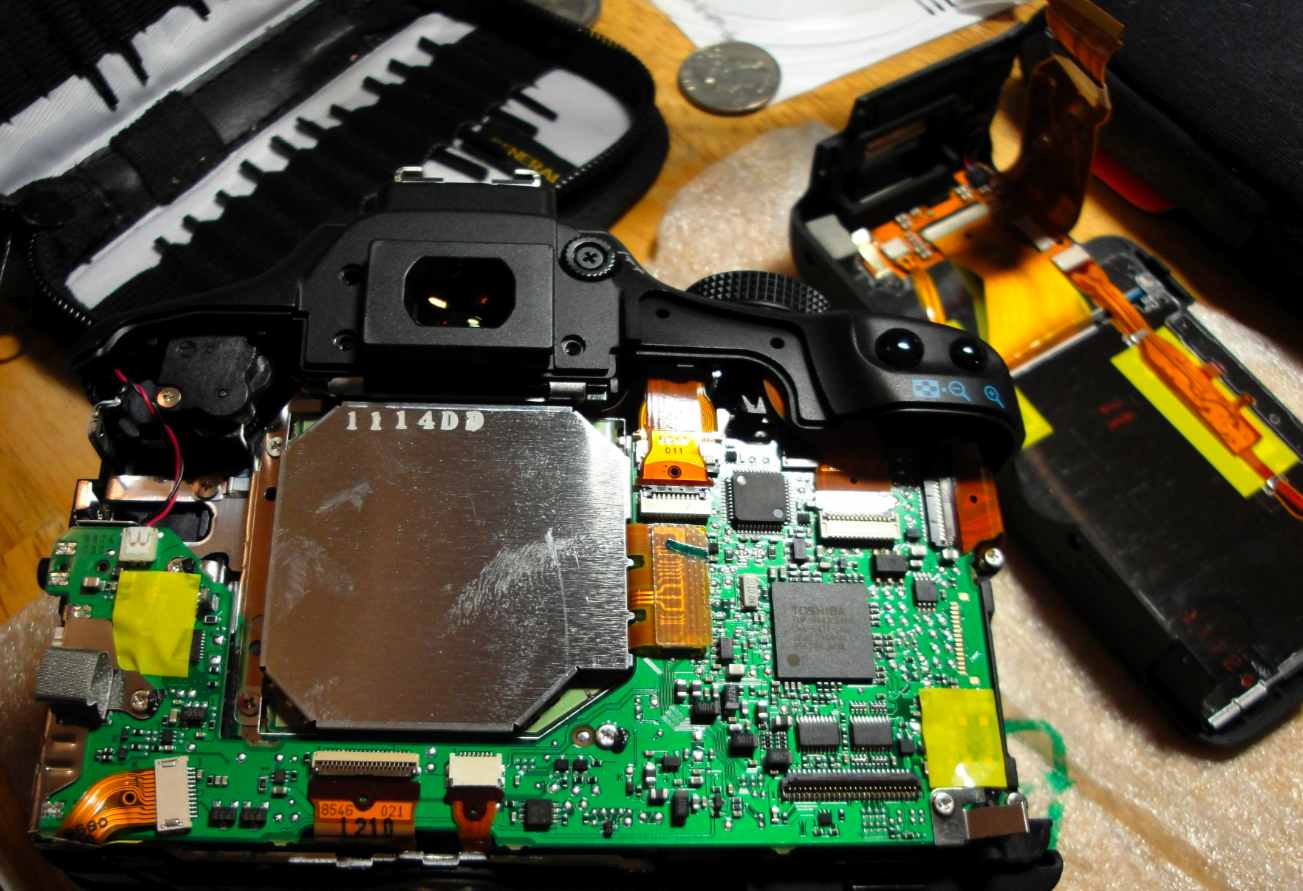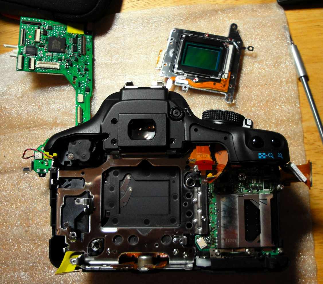 Camera body disassembly: opening the outer camera case. Remove screws around the back of the camera body and prop open the camera. The back of the camera body (where the viewing screen is) comes out.