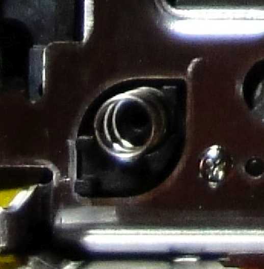 This view shows the lower positioning screw location. The screw has been removed, and the spring is visible below the small metal plate.