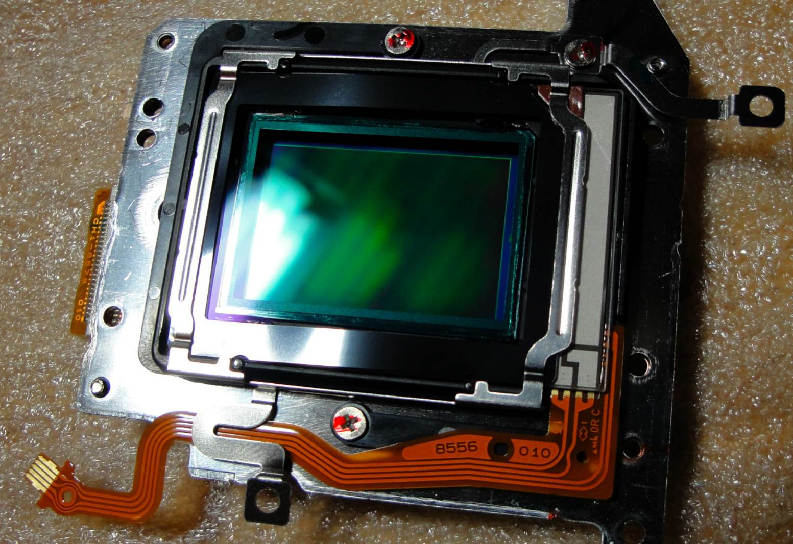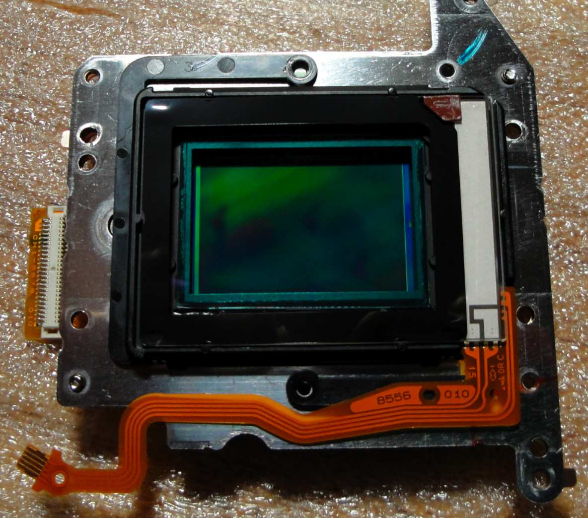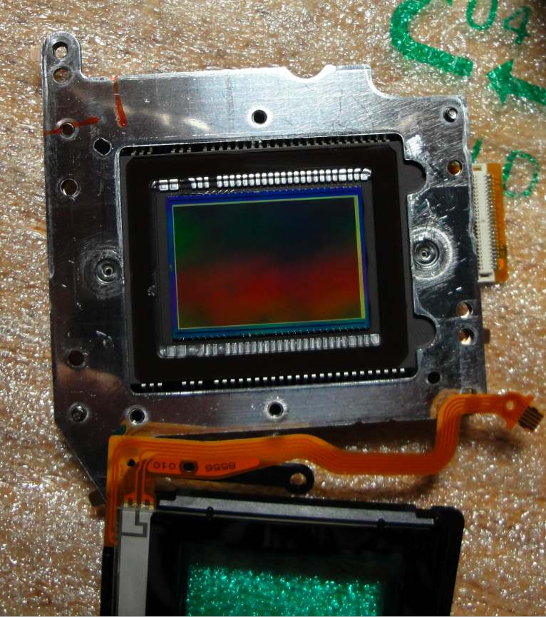 The filter holder is now removed from the detector unit. The near-IR blocking filter gives the blue color visible in this image. The filter holder also includes the anti-aliasing filter.