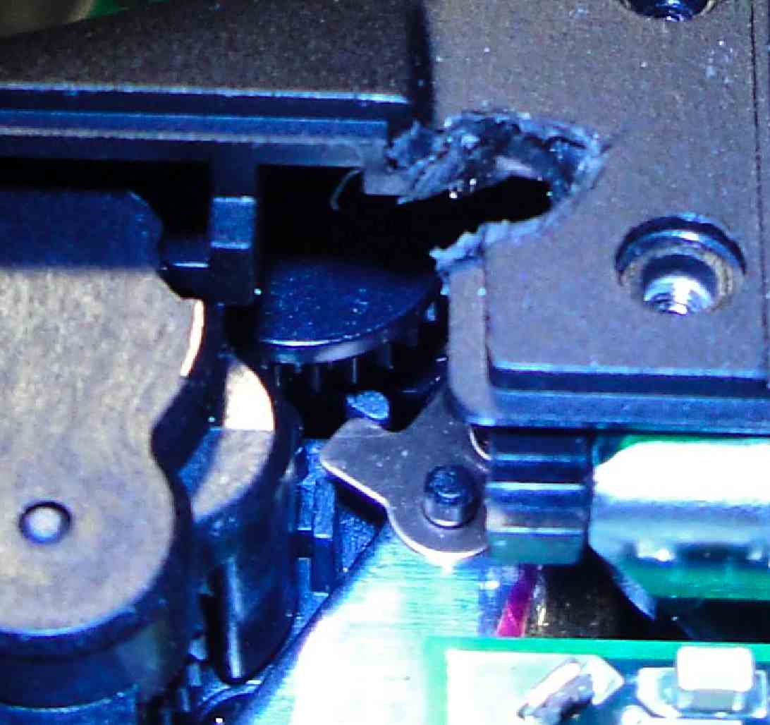 This is a magnified view of the same detector positioning screw. Before removing the detector unit, the depth of each of the 3 positioning stages needs to be measured so that the detector unit can be re-positioned to the approximate same position during re-assembly. The two black blocks around the metal plate provide a good reference surface for this measurement. I used a digital caliper with 10 micron resolution for the measurement.