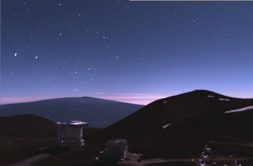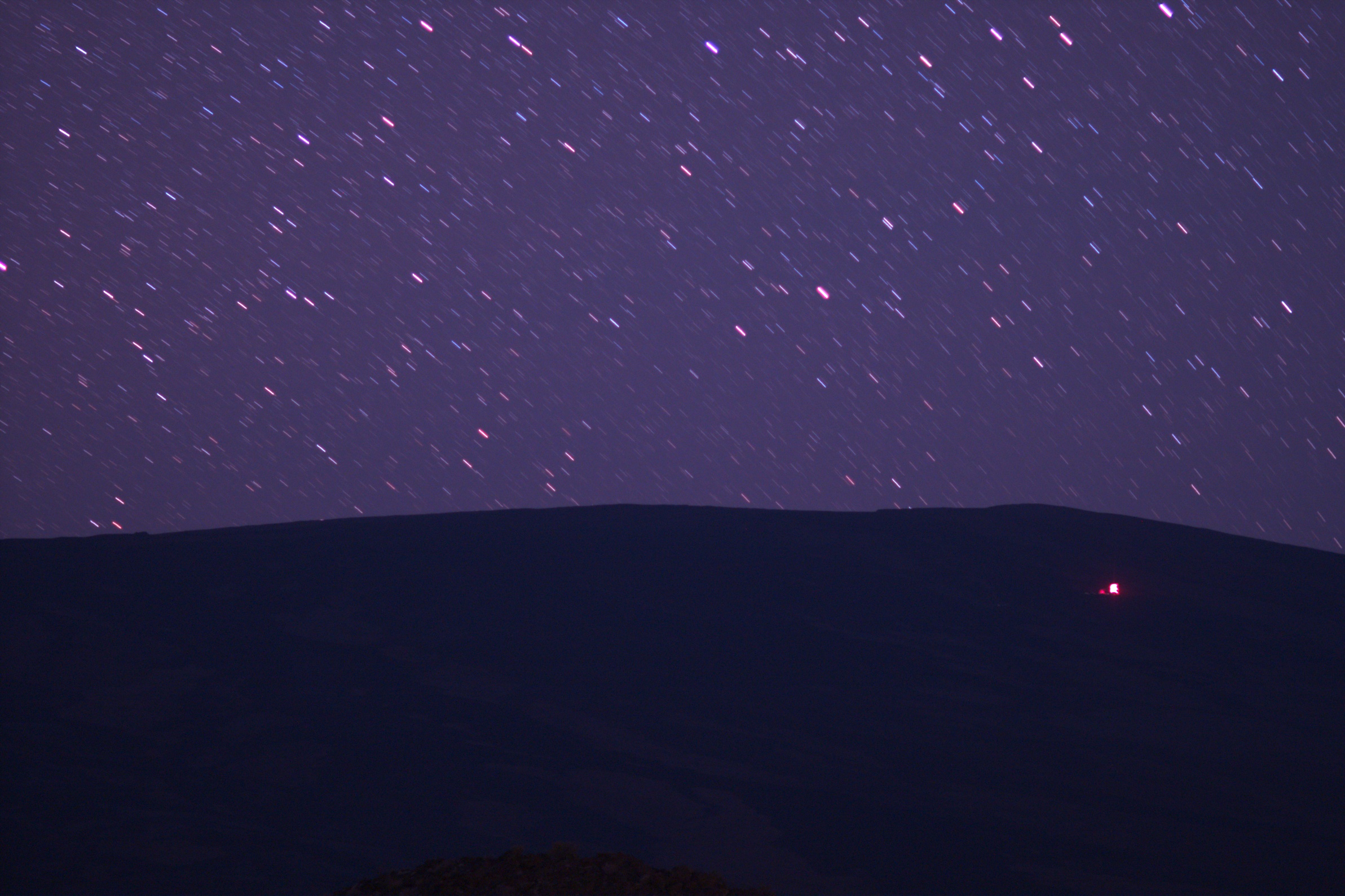 Mauna Kea, as seen from a location near the Mauna Loa observatory. The North star is near the upper left corner. Cars can be seen going up and down the Mauna Kea observatory access road, while a few planes rapidly cross the image, all this while stars quietly drift in the sky around the North star.