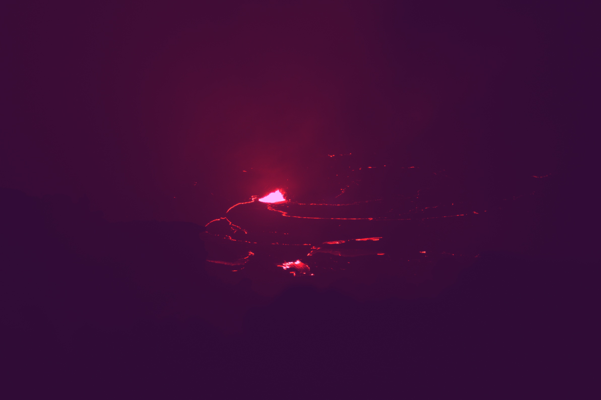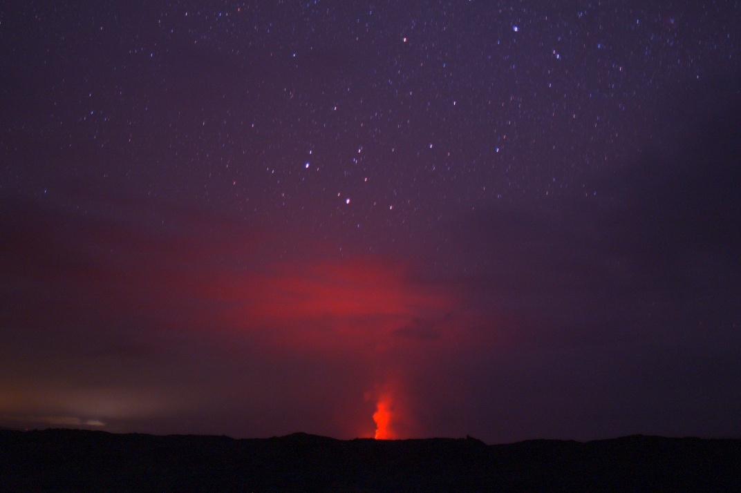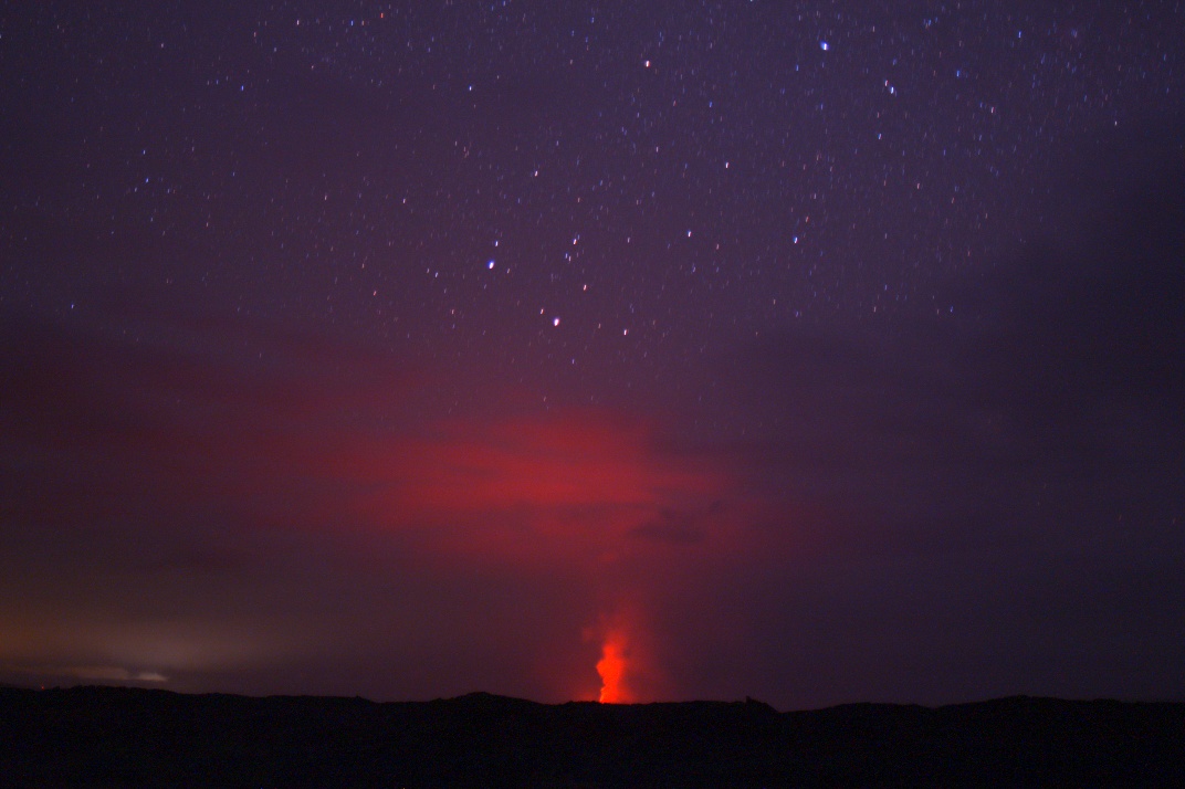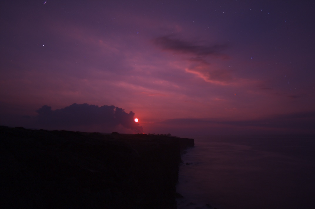 This time lapse was taken a few miles from the Kilauea volcano ocean entry, where lava emerges from a tube to enter the ocean, generating a steam plume. At night, the plume is red, illuminated by lava. The lava also illuminates low-altitude coulds. This time lapse was shot during the Geminid meteor shower, and a few Geminids are visible.