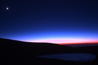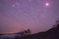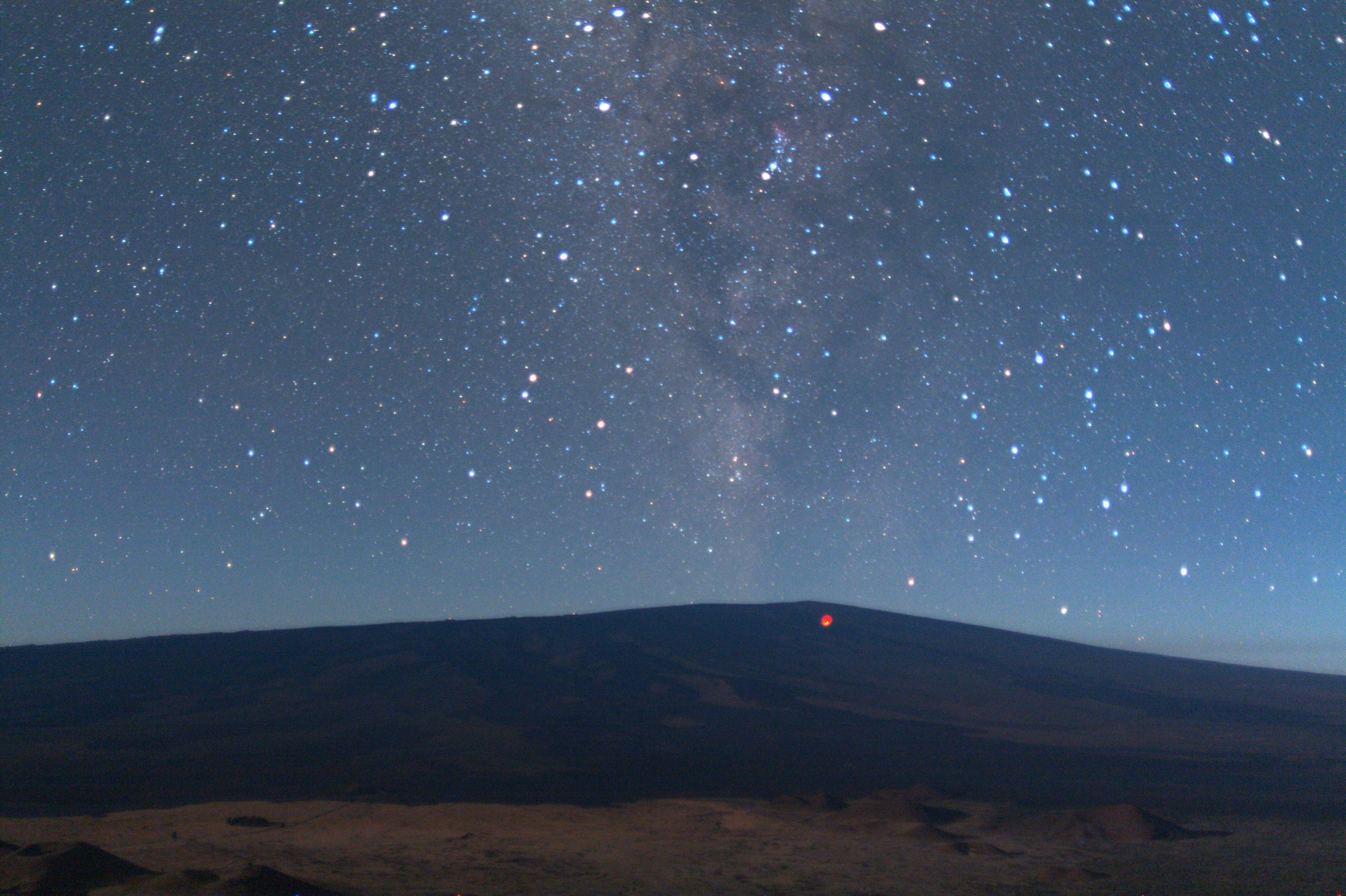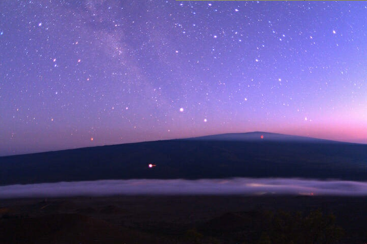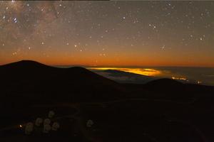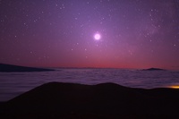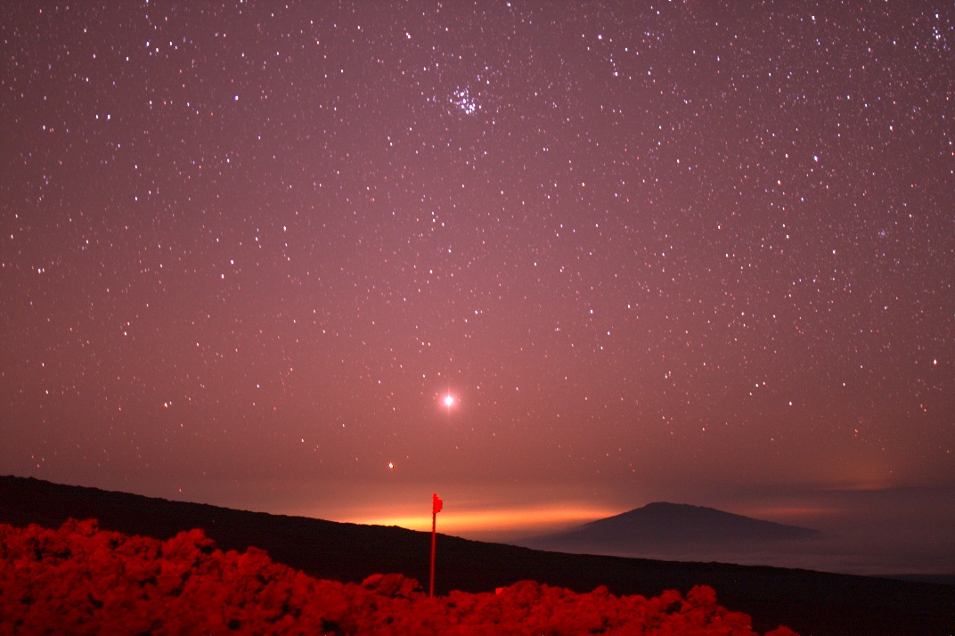 Hualalai (2521 m) is Hawaii's third most active volcano. In this timelapse shot from the slope of Mauna Loa near the Mauna Loa observatory, Jupiter, Venus and then the Pleiades are setting in the western sky, over Hualalai. The faint glow at the horizon in the right is Honolulu, Hawaii's largest city.