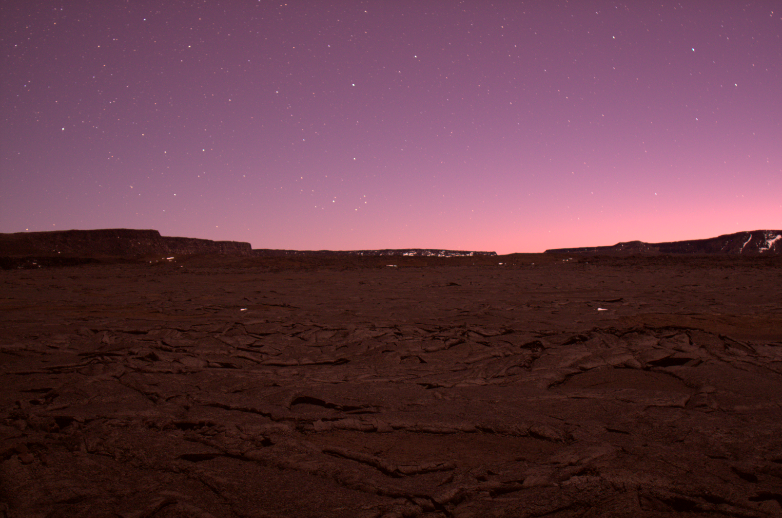 This short video shows stars appearing above the Mauna Loa Caldera at sunset. Some snow is visible on the lava-covered ground.