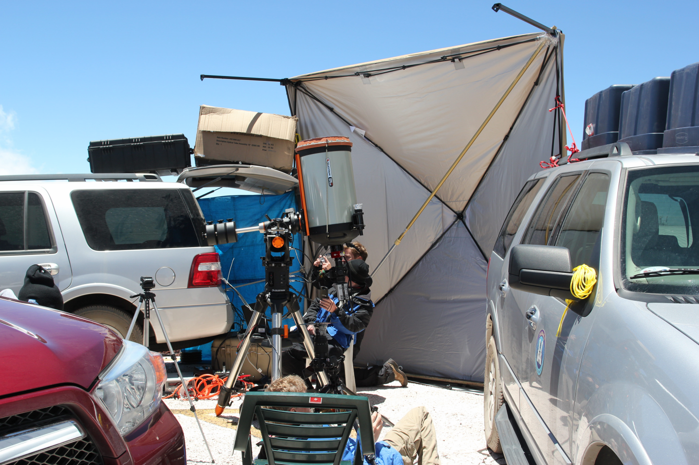 The telescope is shielded from wind by cars and a large tarp