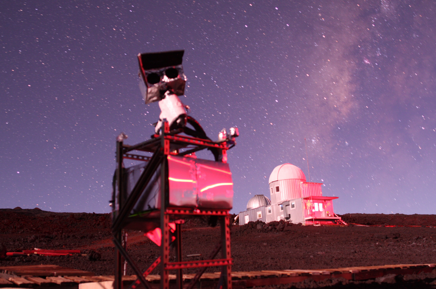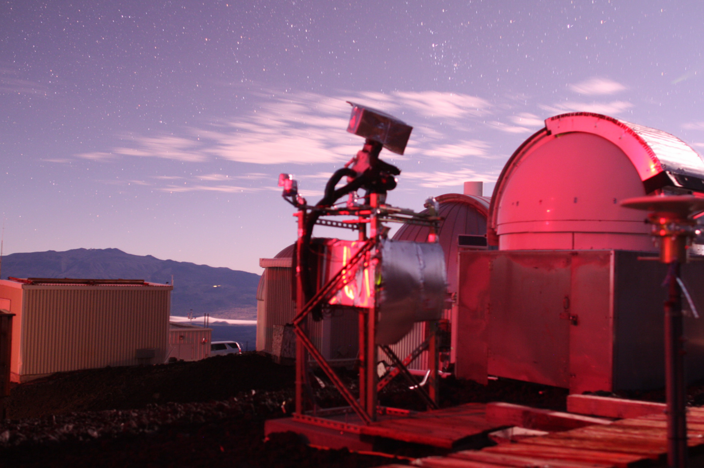 Show content only (no menu, header)Overview, Project goalsThis project is aimed at exploring a low-cost approach to perform a scientifically useful all-sky 3-color imaging survey. The system was installed on Mauna Loa observatory in December 2010, and started fully robotic operation in early 2011 with a single camera. It was upgraded to a 2-camera system in summer 2011. The first year of observations (until summer 2012) was used to evaluate scientific performance and system reliability, as well as develop data reduction algorithms which will process the large volume of data acquired. This project focuses especially on: