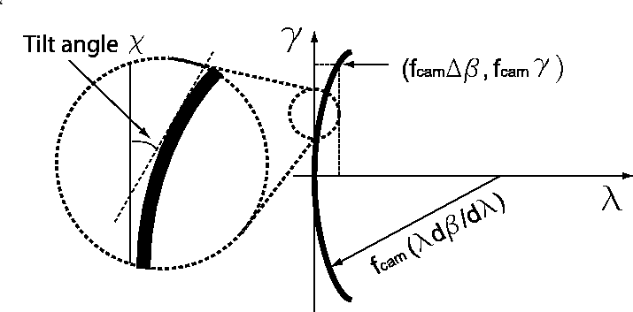 Due to the finite out-of-plane angle, the monochromatic slit image becomes tilted and curved (Figure 5). The tilt angle on the image is given as follows (Schroeder, 1987).