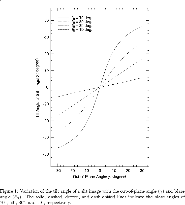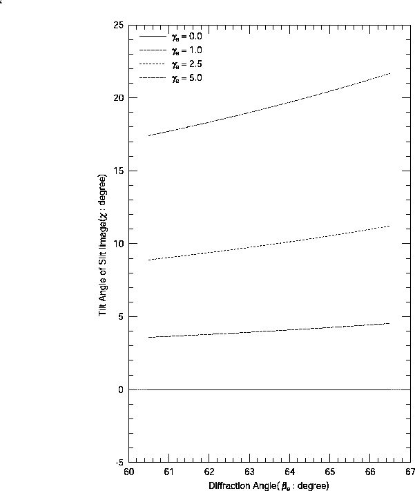 at the blaze wavelength. Figure 6 shows that the tilt of a slit image is sensitive to the out-of-plane angle when the blaze angle of the grating is large.