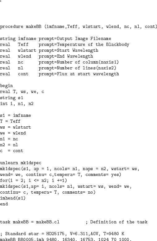 Figure 49 shows an example of IRAF script for making a blackbody spectrum with the same temperature as the standard star and the same wavelength range and image size as the aperture.